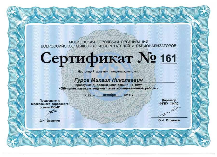 30 октября 2014 года руководитель центра Гуров Михаил Николаевич прошел обучение по программе "Обучение навыкам ведения патентно-лицензионной работы".